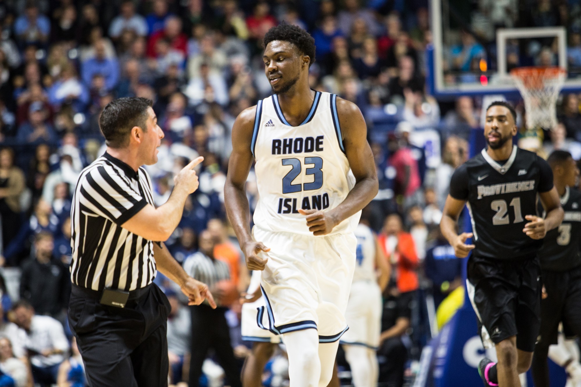 In the first half the Friars started fast as they opened up to a quick 19-8 lead on URI, but the Rams responded fast on the strength of a run of their own. The run ended up being a 28-17 edge for URI, and was led by an unfamiliar face as freshman Christion Thompson canned three three-pointers, including one shot where he was fouled and made the free throw for the four-point play.