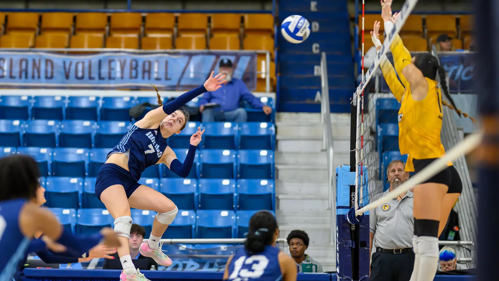 The Flyers came out strong in Friday’s match, not allowing Rhode Island a single lead in the first set and winning 25-17. Wright led all players in the first set with five kills, and Rhode Island’s best hitting percentage of the night (0.097) came in the first set despite the loss.
