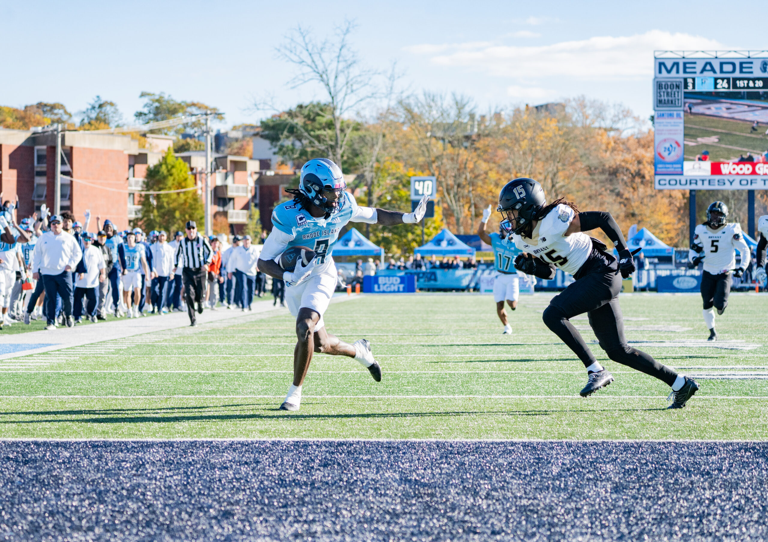 On the ensuing kickoff, Rhody fifth-year kicker Garth White placed his kick right in front of a Bryant returner. The football then took a favorable bounce for the Rams as they were able to recover the kick and start their drive just outside the red zone. Two plays later, Winowich scored his second touchdown as URI went from a 7-0 deficit to a 14-7 lead in less than a minute.