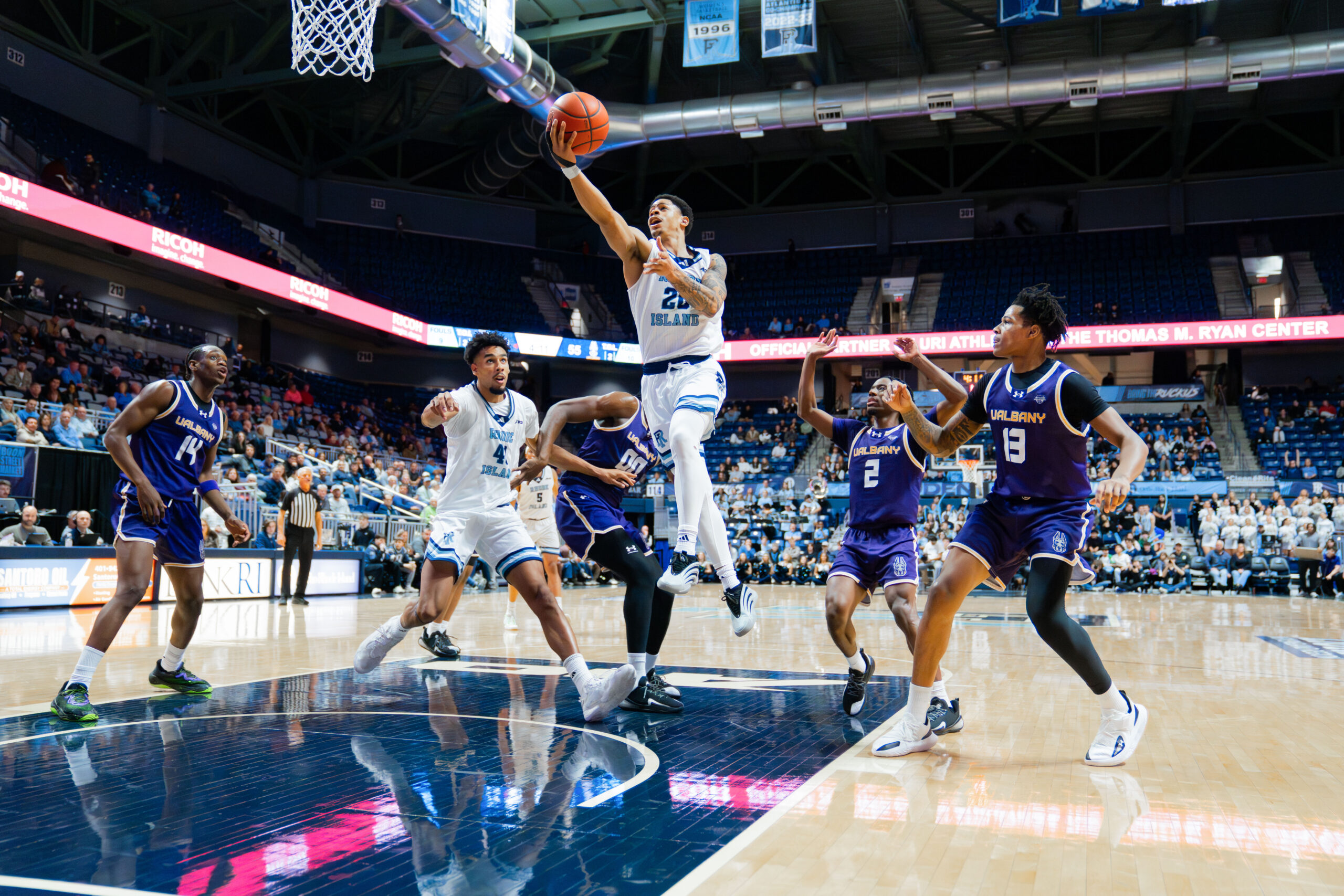 UAlbany took an early 14-5 lead to start the game that forced URI Head Coach Archie Miller to call a timeout. Miller’s adjustments seemed to work, as the Rams ended the first half on a 33-16 run and went into halftime with a 38-30 lead. Rhody third-year Jahmere Tripp and seventh-year guard Tyler Cochran combined to go a perfect 11-11 from the free-throw line. Cochran led the Rams with 15 points on 4-9 shooting and 2-4 from three in the first half.