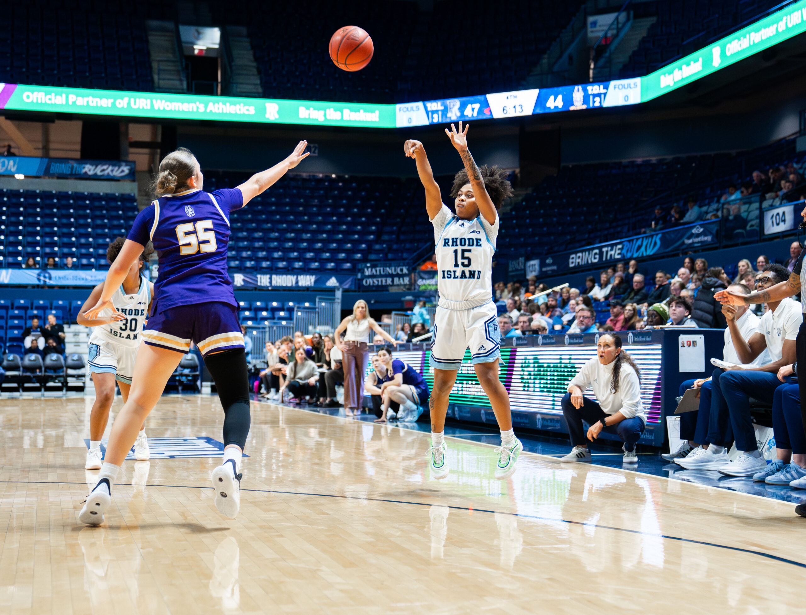 One of the biggest improvements between the halves was ball security. After 12 turnovers in the first half, the Rams had just three turnovers in the final two quarters. UAlbany packed the paint, forcing Rhode Island to look beyond the arc.